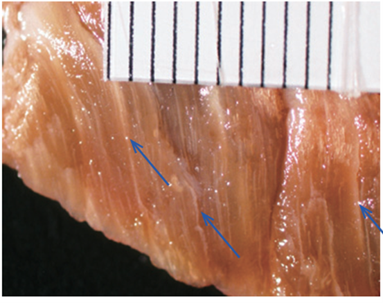 馬刺しに寄生した10mm 程度のザルコシスティスですが、白身の脂と同化して肉眼では識別できません。